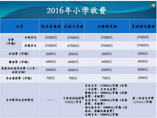 海淀外国语实验学校2016年小学阶段收费标准