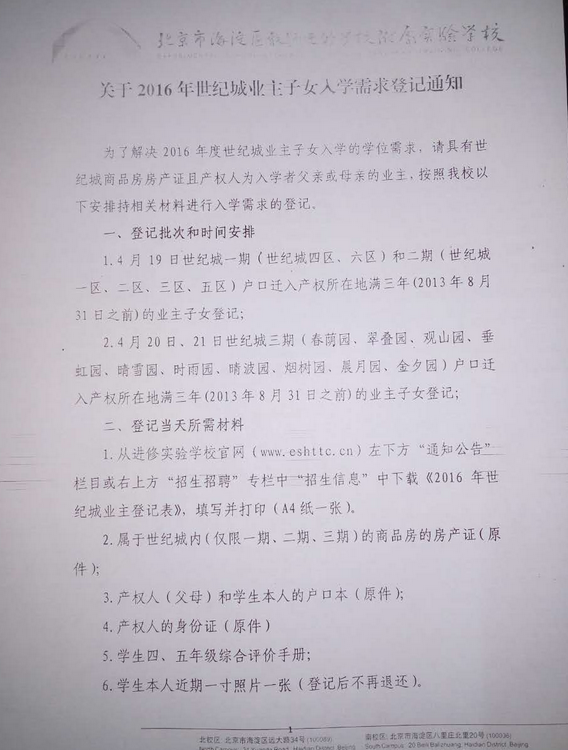 北京市海淀区教师进修学校附属实验学校(简称“教进”)关于2016年世纪城业主子女入学需求登记通知。 来源:新东方在线论坛