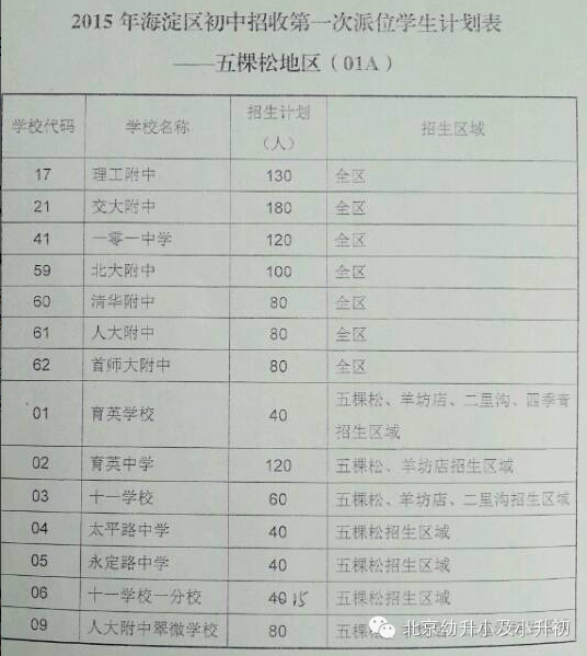 海淀区2015年小升初入学政策公布后,一位热心家长跟莲儿分享了一份《2015年海淀区初中招收第一次派位学生计划-五棵松地区(01A)》,感谢这位家长的热心分享,并非官方发布,仅供参考、查看!
