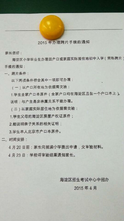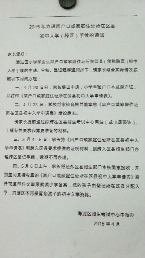 热心家长分享了海淀区2015年小升初回户口或家庭住址手续办理通知,需要办理手续的家长需4月20日前提出申请,详细内容如下。