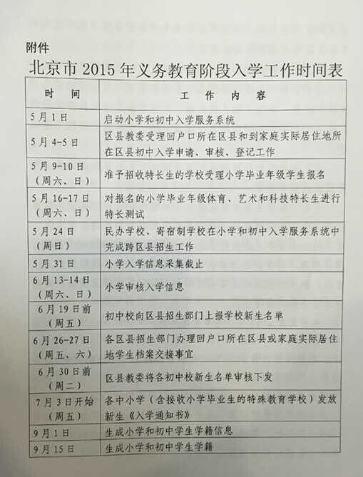 北京市2015年义务教育阶段入学工作时间表中提到特长生测试定于5月16日-17日,民办校、寄宿制学校招生工作需于5月24日完成,以下是详情,供相关家长参考。